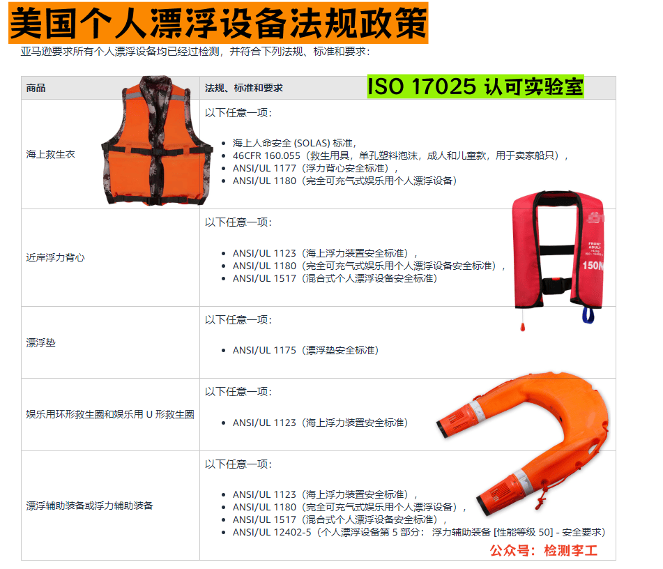 亞馬遜要求所有個人漂浮設備均已經過檢測,并符合下列法規、標準和要求: