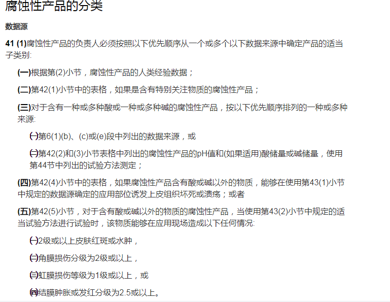 - 腐蝕性產(chǎn)品:分為 “強腐蝕性”“腐蝕性” 和 “刺激性” 三種子類別。確定分類時,同樣優(yōu)先依據(jù)人類使用經(jīng)驗數(shù)據(jù);若沒有,則檢查是否存在特別關(guān)注物質(zhì),接著評估 pH 值和酸 / 堿儲備,再判斷是否存在可引起壞死或潰瘍的腐蝕性物質(zhì),最后評估是否存在可引起紅斑、水腫或眼睛刺激的刺激性物質(zhì)。