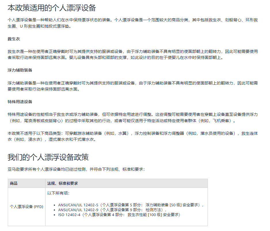 亞馬遜要求所有個人漂浮設備均已經過檢測,并符合下列法規、標準和要求: