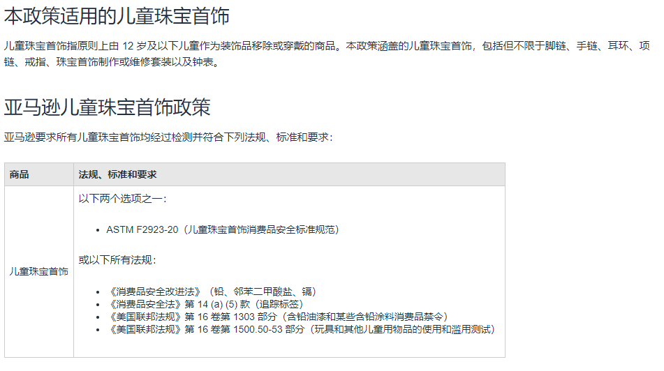 亞馬遜要求所有兒童珠寶首飾均經過檢測并符合下列法規、標準和要求: