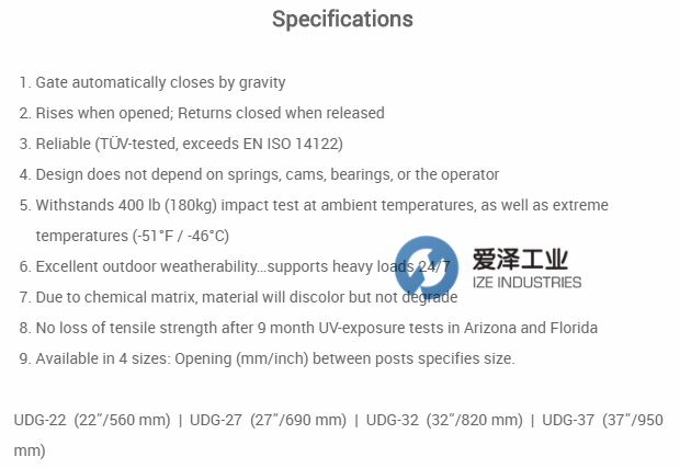 自動關閉雙桿安全門的設計可防止在梯子開口,工作平臺或行人區域從高處掉落。安全門超過了EU ISO 14122-3標準要求,并經過TüV測試。自動關閉門使用重力關閉,因此它不依賴于彈簧,阻尼器,凸輪或操作器。左右安裝相同的鉸鏈很容易安裝。耐腐蝕,免維護。確認符合OSHA要求。