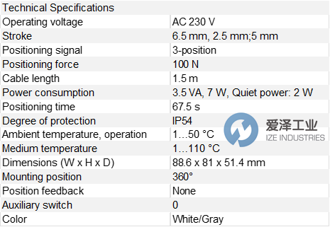 電動執行器,100 N,行程 6.5 mm,IP54,AC 230 V,3 位,27 s/mm,1.5 米電纜