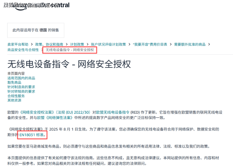 12月15日,亞馬遜官方發布公告,自即日起,所有銷往歐盟市場的聯網設備(如無線電設備、智能家居、智能穿戴等)必須通過EN 18031標準認證,以證明其符合歐盟《網絡安全授權法案》的安全要求。接下來帶大家了解一下EN 18031法規要求