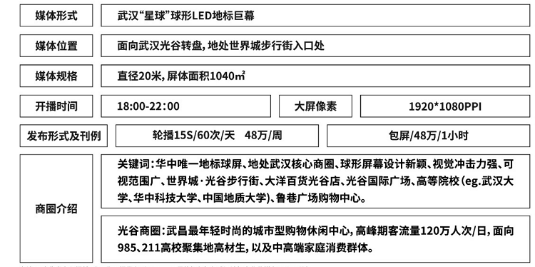 4、最多客流及車流? 地處武漢核心商圈、球形屏幕設計新穎、視覺沖擊力強、可視范圍廣、世界城·光谷步行街、大洋百貨光谷店、光谷國際廣場、高等院校(武漢大學、華中科技大學、中國地質大學)、魯巷廣場購物中心。