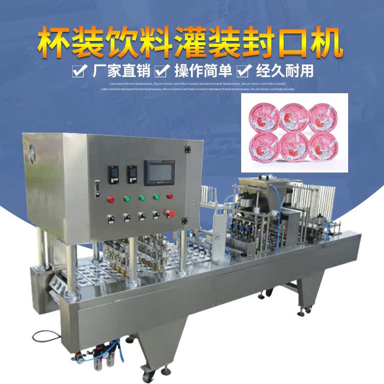 (1)基本工藝:自動落杯,自動活塞式灌裝,自動光電校膜,自動打碼,自動熱壓封口(自動封口兩次),自動切膜,自動收廢膜,自動出杯。