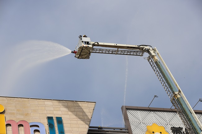 啟動儀式結束后,現場迅速開展了大型商業綜合體滅火救援演練。演練假設堅基購物中心4樓一餐廳發生火災,起火原因為使用明火不慎,燃燒面積約400平方米,火勢發展迅猛,并通過中庭向周邊及上下層蔓延,部分電梯出現人員被困,地下車庫及樓上商場顧客約1400余人需要疏散,情況十分危急。火災發生后,堅基購物廣場微型消防站立即響應,撥打“119”報警,啟動滅火救援應急預案,組織微型消防站隊員引導顧客、群眾疏散,并利用室內消火栓和滅火器材進行滅火。119指揮中心接到報警后,立即啟動大型商業綜合體滅火救援預案,先后調集全市5個消防隊站共15輛消防車、73名消防救援人員趕往現場處置,支隊全勤指揮部遂行出動。同時調集公安、交警、醫療、供電、供水等相關聯動力量到場配合處置。參戰人員通過火情偵察、初戰控火、高空救助、破拆排煙、緊急救助、火場供水、內攻滅火,成功解救疏散被困人員,大火徹底被撲滅,演練取得圓滿成功。