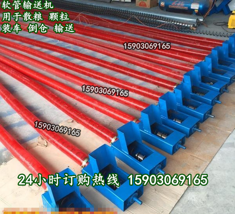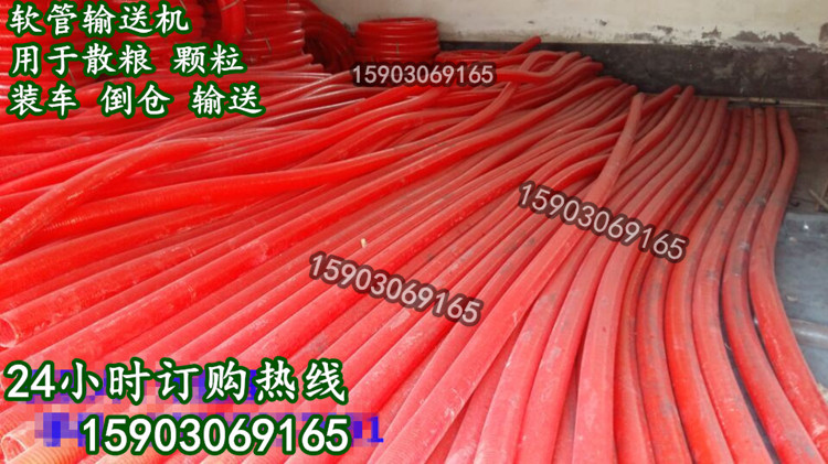 75管徑的花生子上料卸料機 圓形出料口輸送機吸糧機是根據客戶要求現定做的管徑為75mm出料口為圓形的軟管式輸送機,采用耐磨牛筋管可彎曲盤起,4到12米均可定做