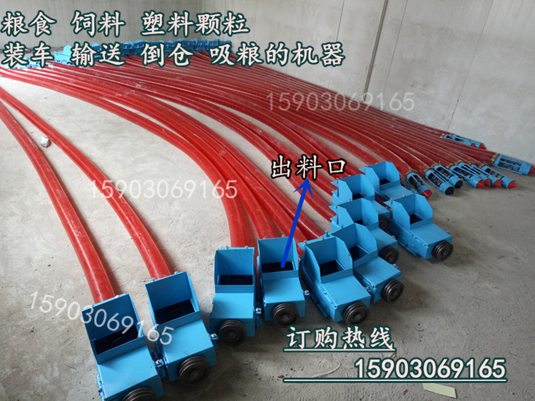 裝玉米苞米 水稻 小麥 糧食的機器 自吸式可彎曲盤起是把進料口插進糧堆自動上料 裝車 輸送的軟管自吸式可彎曲盤起的機器通常稱作軟管輸送機或吸糧機,本機器每小時5到8噸管徑10公分4到12米均有現貨 成本低 體積小可裝多種農作物顆粒 玉米 苞米 小麥 糧食 雜糧等,多用于個體收糧戶 糧站 糧庫等