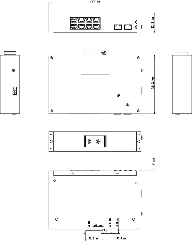 端口2個Hi-PoE口,6個PoE口,2個千兆光口;2個千兆Hi-PoE電口,6個千兆PoE電口,2個千兆光口