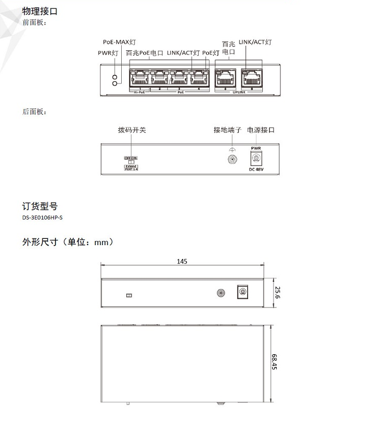 DS-3E0106HP-S 海康威視二層非網管全百兆HIPOE交換機 規格參數: