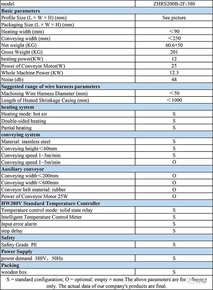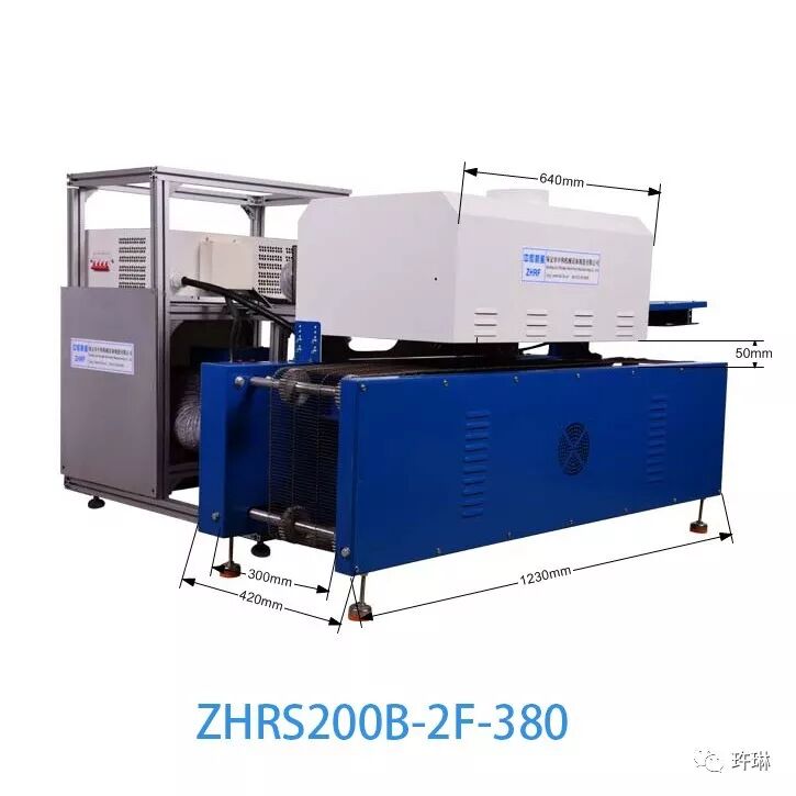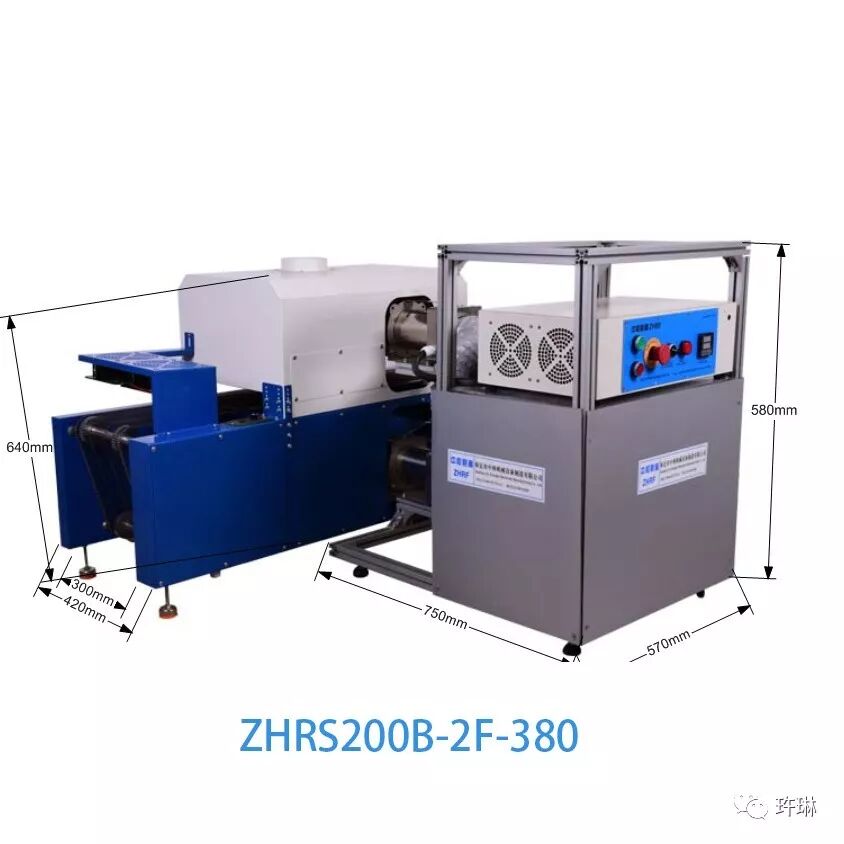 ZHRS200B-2F-380 is a conveyor belt heat shrinkable tube heating machine, designed for mass production. The heating machine and the conveyer are used together to realize the precise heating of the heat shrinkable tube without damaging the wire. By manually adjusting the speed, the speed of the conveyor belt is kept unib. The vertical distance and the parallel distance of the heating port to the conveyor belt can be adjusted, and the heat shrinkable tube of different size components can be heated. It is especially suitable for heating high temperature Teflon heat shrinkable tubes or large diameter and long heat shrinkable tubes.