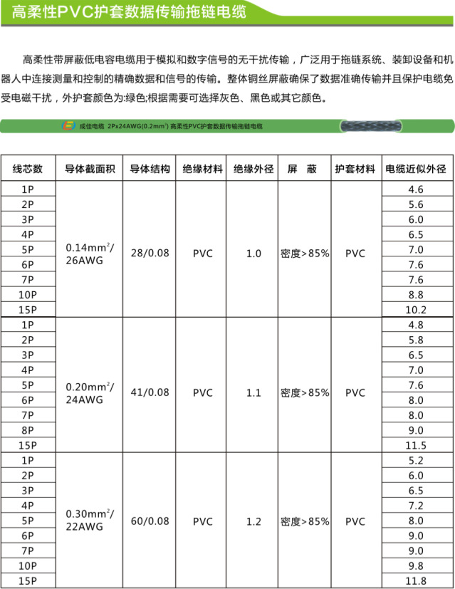 1、電線規格(銅平方數,芯數,護套外徑,護套材質等,是否雙絞,是否屏蔽,護套顏色等)