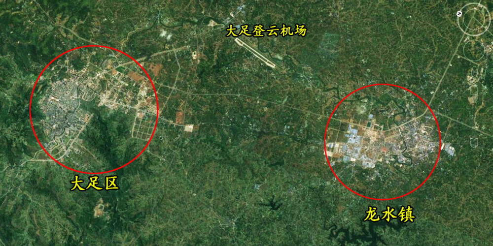 從衛星地圖上可以直觀的看到,龍水鎮的場鎮(亦可稱為城鎮)和大足城區相差并不大,龍水鎮的成績有目共睹。