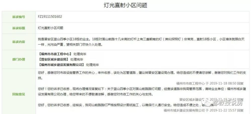 近日,有晉安區藍山四季小區18棟的業主在福州12345上進行投訴。其表示藍山四季18棟對面的山前路,十幾米高的燈桿上有三盞朝南的燈(類似探照燈)非常亮,直射該棟樓,照得小區墻體就跟白天一樣。訴求人認為這會產生嚴重的光污染,望相關部門盡快介入處理。