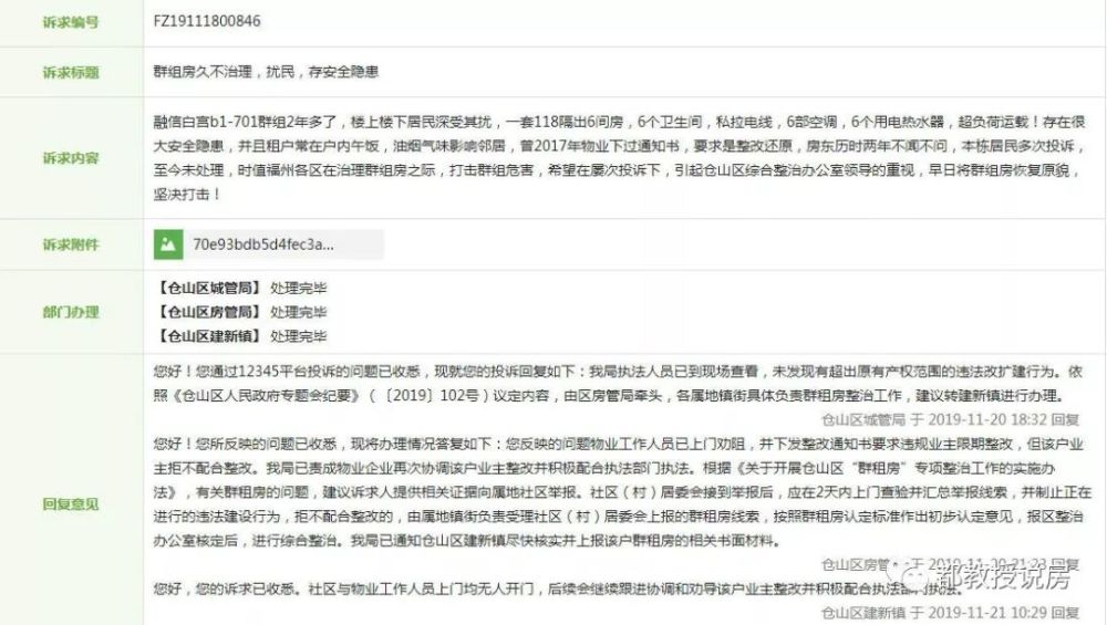 倉山區房管局11月20日答復:您反映的問題物業工作人員已上門勸阻,并下發整改通知書要求違規業主限期整改,但該戶業主拒不配合整改。我局已責成物業企業再次協調該戶業主整改并積極配合執法部門執法。根據《關于開展倉山區“群租房”專項整治工作的實施辦法》,有關群租房的問題,建議訴求人提供相關證據向屬地社區舉報。