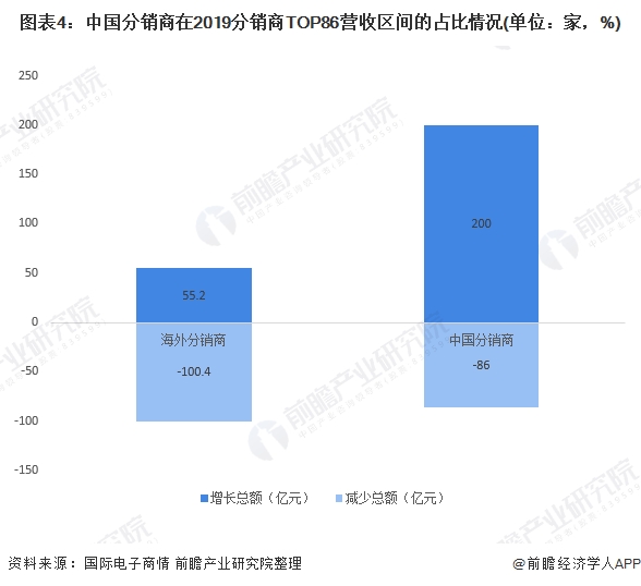 營(yíng)收增長(zhǎng)方面,海外分銷(xiāo)商增長(zhǎng)總額達(dá)55.2億元,少于減少總額,整體來(lái)看,屬于負(fù)值;反觀(guān)中國(guó)分銷(xiāo)商,在36家分銷(xiāo)商中,中國(guó)同比上升的企業(yè)數(shù)(12家)雖然少于同比下降的企業(yè)數(shù)量(14家),但是增長(zhǎng)總額達(dá)200億元,多于減少總額100多億。表明我國(guó)分銷(xiāo)商“化危為機(jī)”的盈利能力較強(qiáng)。