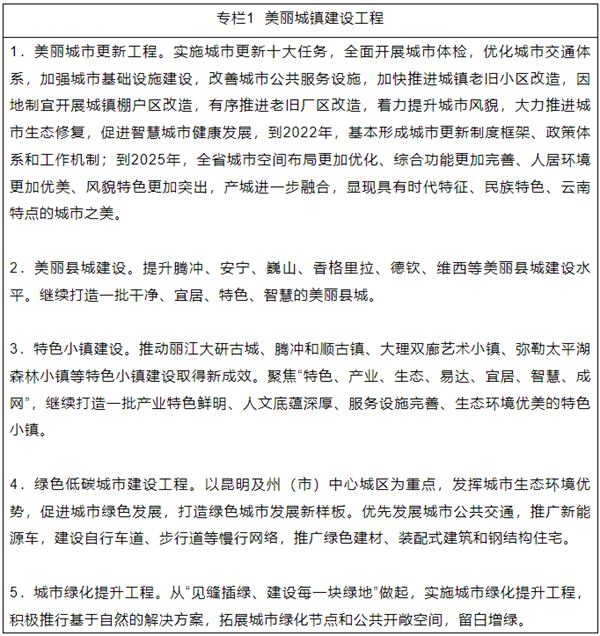 建設高品質綠色生態城鎮。突出生態共建環境共治,優化城市群內部空間結構,構筑生態和安全屏障,形成多中心、多層級、多節點的網絡型城市群。在實施城市更新工程中,推進低碳城市和美麗城鎮建設,按照資源環境承載能力合理確定城市規模、人口密度和空間結構,統籌安排城市建設、產業發展、生態涵養、基礎設施和公共服務,加快轉變城市發展方式。以滇中城市群生態建設規劃為支撐,實現滇中城市群基礎設施、產業發展、生態環保、要素市場、基本公共服務和社會治理一體化發展。統籌兼顧昆明城市經濟、生活、生態、安全等多元需要,轉變開發建設方式,注重自然山水和城市形態有機融合,塑造特色濱水空間、特色環山空間,建設一批城市公園和城市生態綠道,實施沿路、沿江環境整治提升行動。堅持內涵式、集約型、綠色化,推動州(市)政府所在地建設花園城市,完善生態宜居宜業功能,提升綠色低碳發展水平和品質。聚焦“干凈、宜居、特色、智慧”,解決突出問題,補齊短板弱項,拓展縣級城市生態宜居功能,推動美麗縣城建設邁上新臺階。合理支持農產品主產區、重點生態功能區縣城建設,防止“攤大餅”無序擴建侵占耕地和生態空間。聚焦“特色、產業、生態、易達、宜居、智慧、成網”,建成一批特色生態小鎮,爭當城鄉人居環境改善排頭兵。