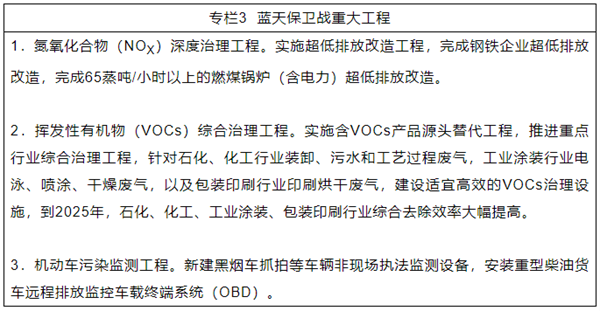 加強大氣多污染物協同防控。加強細顆粒物和臭氧協同控制,抓好氮氧化物和揮發性有機物等多污染物協同減排,穩步提升大氣環境質量。實施重點領域、重點行業減排工程,強化控煤、控氣(廢氣)、控車、控塵、控燒措施,持續推進污染源治理,著力推進多污染物協同減排。實施重點行業氮氧化物等污染物深度治理,強化焦化、建材、有色等行業工業爐窯綜合治理,全面完成鋼鐵企業超低排放改造工程,實施粗鋼產能清理整頓。以石化、化工、工業涂裝、包裝印刷、油品儲運銷、汽車維修(維護)等領域為重點,開展揮發性有機物污染綜合治理。嚴格機動車等移動源尾氣排放管控,持續打好柴油貨車污染治理攻堅戰。突出抓好揚塵、惡臭異味和餐飲油煙精細化管控。完善城市網格化監管機制,加強綠色施工管理。加強消耗臭氧層物質和氫氟碳化物環境管理。加強其他涉氣污染物治理。