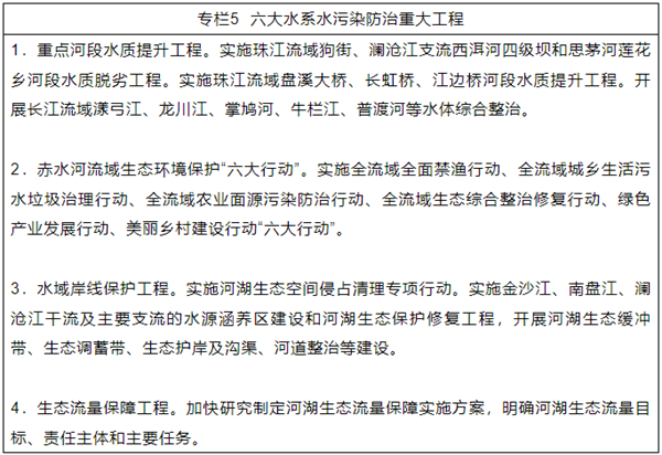 加大六大水系水污染防治力度。堅持共抓大保護、不搞大開發,實施長江禁漁整治,保護和恢復珍稀魚類種群資源,深入推進金沙江流域保護修復和污染防治,確保干流水質達到ⅱ類。全面加強赤水河流域(云南段)生態環境保護,抓好入河排污口整治,打造長江上游最美生態河流和綠色高質量發展示范區。以磷污染治理和重金屬環境風險防控為重點,深入推進珠江流域水污染防治,確保干流水質達到ⅲ類。按照“干流保護為主,支流重點防治”的原則,確保西南諸河跨境河流水環境安全。強化“保好水”與“治差水”協同推進,確保優良水體比例穩定提升,基本消除劣ⅴ類水體。推進重點流域岸線生態修復,加強小水電站清理整頓,保障河道生態流量。強化水陸統籌,推進上下游、左右岸、干支流協同治理。加強長江入河排污口排查整治,強化截污治污。推進地下水環境狀況調查評估,加強重點區域地下水污染風險管控。優化地表水生態環境質量目標管理,開展河湖水生態考核評價試點。
