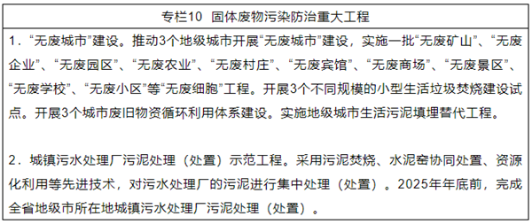 加快提升固體廢物污染防治水平。推進固體廢物管理制度改革,加強源頭減量和資源化利用,促進主要工業廢棄物利用,加快構建廢舊物資循環利用體系。推進全省廢鋼鐵加工、廢礦物油和廢舊輪胎綜合利用等行業規范發展,推動新能源汽車動力蓄電池回收利用體系建設。推動大宗工業固體廢物貯存處置總量增長趨零,持續實施歷史遺留工業固體廢物堆場治理。推行生活垃圾分類,加快垃圾焚燒設施建設,生活垃圾日清運量超過300噸的城市力爭實現原生垃圾零填埋,開展小型生活垃圾焚燒建設試點,深入開展非正規垃圾填埋場排查整治。加強白色污染治理,積極推廣替代產品。加強無廢社區、企業、學校等“無廢細胞”建設,以州(市)政府所在地城市為重點開展“無廢城市”建設。全面禁止進口固體廢物,持續保持打擊“洋垃圾”走私高壓態勢。