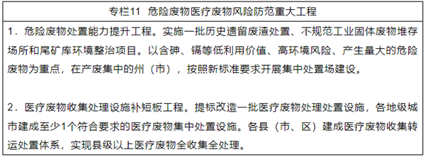 加強危險廢物醫療廢物收集處理。統籌危險廢物集中處置利用設施建設,提升收集、處置與利用能力,實現處置能力與產廢情況總體匹配。提升企業、各類開發區危險廢物自行處置利用能力,健全收運體系,開展危險廢物集中收集貯存試點。健全醫療廢物收集轉運處置體系,提升縣(市、區)醫療廢物收集轉運處置能力。完善醫療廢物應急處置物資儲備體系,保障重大疫情醫療廢物應急處置。提升危險廢物監管、處置利用和環境風險防范預警與應急管理能力。深入開展危險廢物規范化環境管理與專項整治,建立危險廢物跨省轉移“白名單”制度,嚴厲打擊危險廢物非法轉移傾倒等違法犯罪行為。