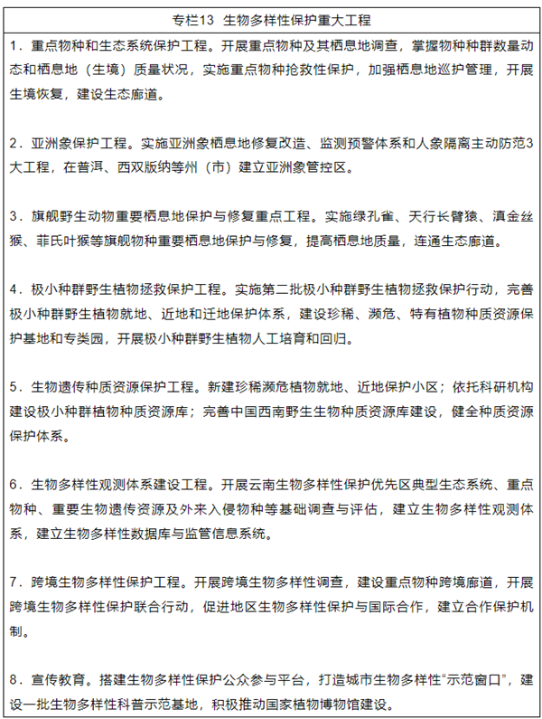 開展生物多樣性調查監測評估。推進重要生態功能區和生物多樣性保護優先區域的生物多樣性本底調查,持續開展農作物、畜禽品種、藥用植物、野生菌種等生物遺傳和種質資源以及相關傳統知識的調查、編目,建立生物多樣性數據庫與監管信息系統。定期更新生物物種名錄、生物物種紅色名錄、外來入侵物種名錄、重點保護動植物物種名錄。構建生物多樣性定位觀測網絡,加強典型生態系統、重點保護物種和重要生物遺傳資源的觀測,開展氣候變化與生物多樣性觀測與研究。推動生物多樣性監測現代化,加強生物多樣性數據共享,建立預警技術體系和應急響應機制。探索建立云南生物多樣性保護評估標準體系和評價技術規范,定期發布云南生物多樣性保護成效綜合評估報告,開展大型工程建設、資源開發利用等專項生物多樣性影響評價,開展外來物種入侵、氣候變化以及自然災害等對區域生物多樣性的影響評估。