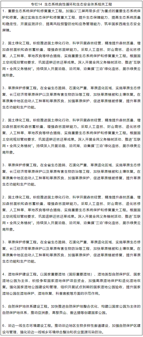圍繞全面構建以生態系統良性循環和環境風險有效防控為重點的生態安全體系,廣泛推行基于自然的解決方案,加強生態系統保護修復,強化生物多樣性保護和生物安全保障,增強重點區域生態功能,增值生態資產,筑牢國家西南生態安全屏障,保障國土生態安全。