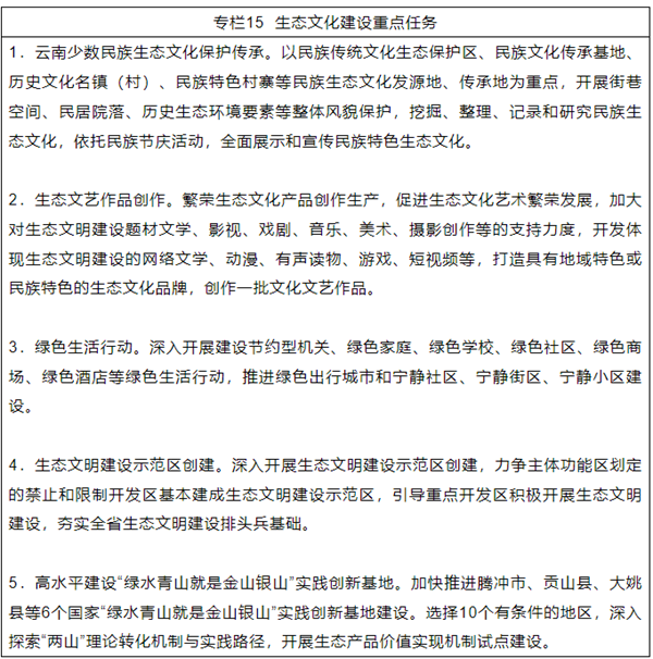 繁榮社會主義生態文化。加強社會主義生態文化基礎理論研究與實踐應用。加大生態文明建設題材作品創作力度,鼓勵開發生態文化產品,打造生態文化品牌,創作一批生態文化文藝作品,建設一批生態文化教育基地。抓好生態文明傳播平臺建設,開展生態文明建設主題傳播活動,講好生態文明建設的云南故事。