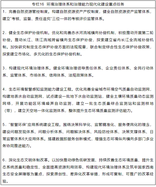 建立健全全過程監管體系。嚴格環境準入管理,建立以“三線一單”生態環境分區管控體系為基礎的區域生態環境管理格局,全面落實環境影響評價制度和排污許可制度,強化規劃環評質量與效力監管。提升生態環境監測預警能力和監督執法水平,健全生態環境網格化監管體系以及“雙隨機、一公開”環境監管、聯合執法、區域交叉檢查和專案查辦等制度,完善區域協作機制,推進環境司法聯動。實行重大生態環境問題整改閉環管理,全面建立省、州(市)、縣(市、區)三級生態環境問題報告制度。強化生態環境信息公開,健全公眾監督的生態環境治理全民行動體系。