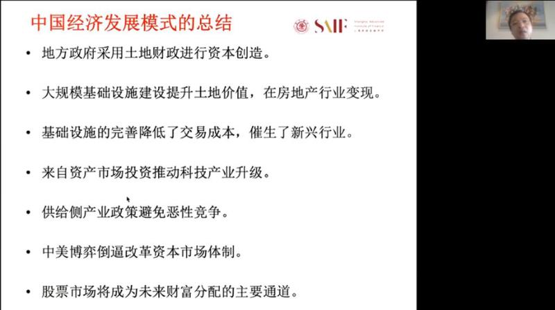 陳欣教授主要講授了在中國特色的制度環境下,上市公司如何利用資本市場探索適合自身的商業模式以及投融資渠道,最終實現成功發展的過程。首先,陳欣教授詳細介紹了近二十年中國貨幣發行量的變化(m1、m2增速及剪刀差)、人民幣兌美元匯率的波動以及2000年以來中國對美國貿易順差的擴大趨勢,講述了中國經濟的內生增長機制同西方經濟體的本質區別。陳教授進一步以上海臨港、萬科、京滬高鐵、工商銀行、拼多多、快手、蔚來汽車等眾多上市公司的股票表現為例,分析了土地財政、房地產行業、基礎設施建設、金融行業、互聯網行業、地方政府的產業投資以及傳統工業等行業對中國經濟獨特的發展模式的重要作用,并深入分析了中國經濟過去發展模式的優劣勢。最后,陳教授講述了中國正處于重塑國際經濟秩序的關鍵階段,在人口老齡化、消費升級、中國產業和人民幣的國際化等背景下,我國將繼續促進房地產市場平穩健康發展、保持資本市場平穩運行、促進平臺經濟健康發展的大趨勢。