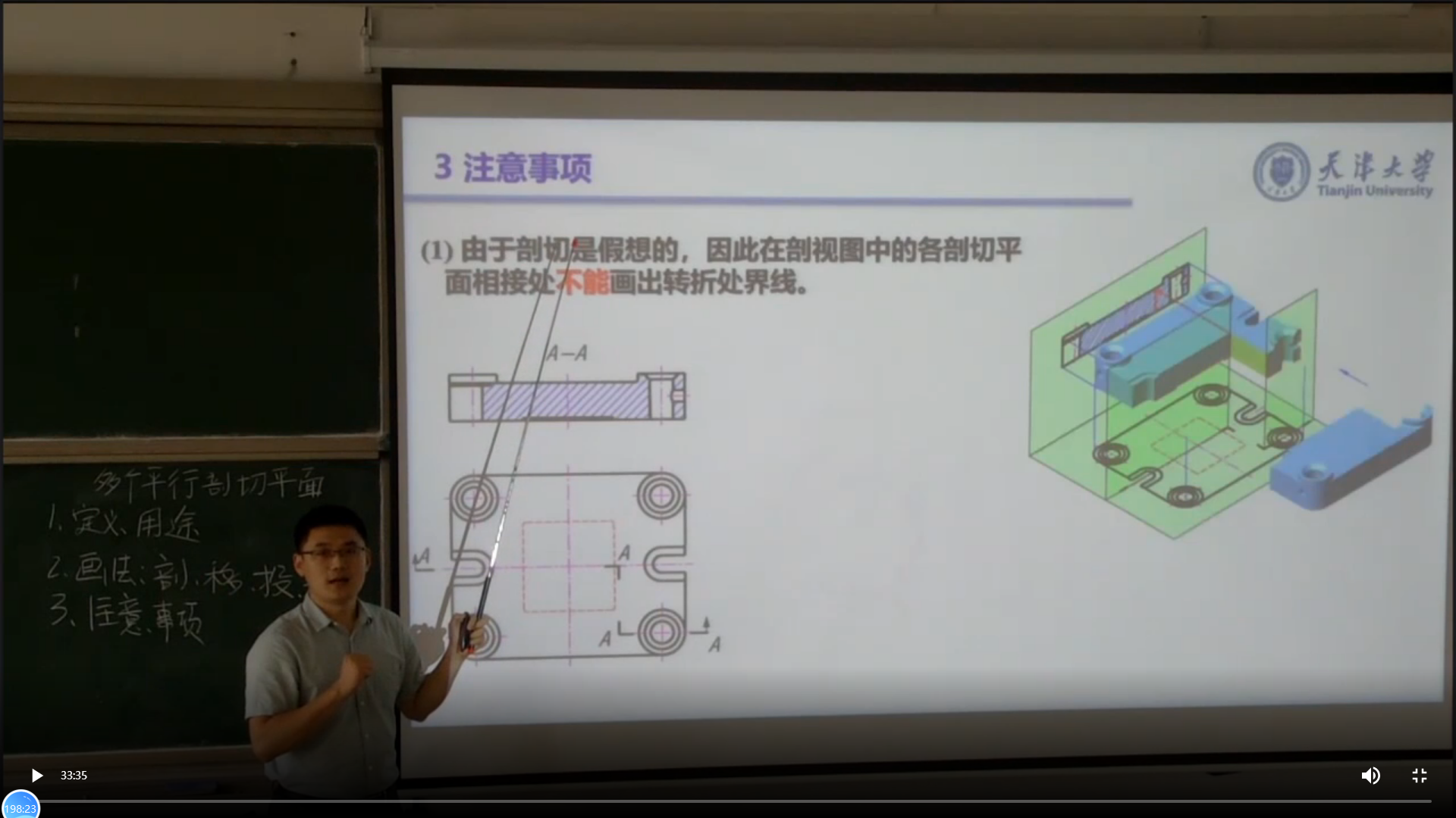 最后一位報告嘉賓是天津大學機械工程學院碩士生導師李士鵬,李老師帶來的報告題為《剖視圖-幾個平行的剖切平面》課程教學示范。報告圍繞“剖視圖”這一工程圖學中重點內容,通過展示“幾個平行剖切平面的剖視圖”的教學內容,研討教學目標、重點、難點如何講授,思政元素融合技巧、教學流程的設計恰到好處。