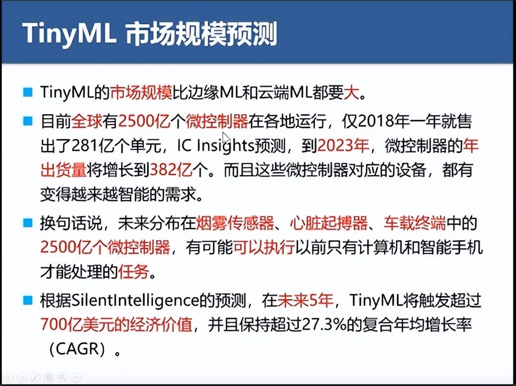 ieee 會(huì)士、iapr 會(huì)士、澳門大學(xué)科技學(xué)院計(jì)算機(jī)與信息科學(xué)系講座教授、香港浸會(huì)大學(xué)計(jì)算機(jī)科學(xué)系榮譽(yù)教授唐遠(yuǎn)炎教授的報(bào)告是“機(jī)噐學(xué)習(xí)微型化---下一輪人工智能技術(shù)的一個(gè)方向”。唐教授提到人工智能(ai)正在加速?gòu)摹霸贫恕弊呦颉斑吘墶?,進(jìn)入到越來(lái)越小的物聯(lián)網(wǎng)設(shè)備中。在終端和邊緣側(cè)的微處理器上,實(shí)現(xiàn)機(jī)器學(xué)習(xí)過(guò)程,被稱為“微型機(jī)器學(xué)習(xí)”,即tinyml。tinyml是指工程師們?cè)诤镣吖β剩╩w)范圍以下的設(shè)備上,實(shí)現(xiàn)機(jī)器學(xué)習(xí)的方法、工具和技術(shù)。tinyml是機(jī)器學(xué)習(xí)和嵌入式物聯(lián)網(wǎng)設(shè)備的交叉領(lǐng)域,是一門新興的工程學(xué)科,具有革新許多行業(yè)的潛力。最后唐教授介紹了微型機(jī)器學(xué)習(xí)的最新研究進(jìn)展。