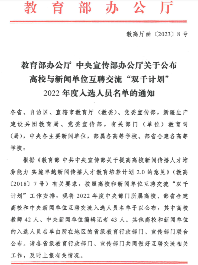 為不斷深化高等新聞傳播教育綜合改革、提高新聞傳播人才培養(yǎng)質(zhì)量,教育部、中共中央宣傳部2013年、2018年先后發(fā)布《關(guān)于加強(qiáng)高校新聞傳播院系師資隊伍建設(shè) 實施卓越新聞傳播人才教育培養(yǎng)計劃的意見》(教高【2013】年7號)和《關(guān)于提高高校新聞傳播人才培養(yǎng)能力 實施卓越新聞傳播人才教育培養(yǎng)計劃2.0的意見》(教高【2018】年7號),啟動實施高校教師與新聞單位從業(yè)人員互聘交流計劃。該計劃旨在造就一批具有家國情懷、國際視野的高素質(zhì)全媒化復(fù)合型專家型新聞傳播后備人才;造就一批適應(yīng)媒體深度融合和行業(yè)創(chuàng)新發(fā)展,能夠講好中國故事、傳播中國聲音的優(yōu)秀新聞傳播后備人才。我校黃雯老師是迄今我校在教育部、中宣部在新聞傳播領(lǐng)域互聘交流的“雙千計劃”歷史上的唯一入選人才,此次入選“雙千計劃”也是人文與社會科學(xué)學(xué)院自2020年重構(gòu)改革以來在新聞傳播學(xué)術(shù)與應(yīng)用“旋轉(zhuǎn)門”互聘交流的重大模式創(chuàng)新。