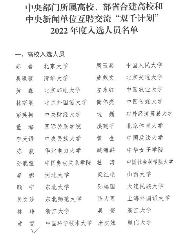 近日,教育部、中共中央宣傳部公布了高校與新聞單位互聘交流“雙千計劃”2022年度入選人員名單,我校人文與社會科學(xué)學(xué)院科技傳播系黃雯老師入選。