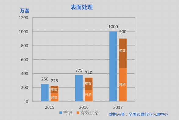 由于國家加強環(huán)保檢查等因素,最近幾年與實際需求比,電鍍與烤漆的有效供給均存在一定程度的結(jié)構(gòu)性短缺,其中電鍍供應(yīng)結(jié)構(gòu)性短缺較為嚴(yán)重,約達(dá)20%,烤漆供應(yīng)結(jié)構(gòu)性短缺約5%。未來包括金屬貼膜、鋼化玻璃、陶瓷等工藝將有可能更多的應(yīng)用于智能鎖領(lǐng)域。