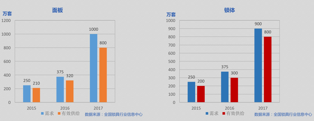 近3年來,智能鎖的面板和鎖體的總體生產(chǎn)量,雖然基本能滿足需求,但存在較嚴(yán)重的結(jié)構(gòu)性的需求缺口,其中面板結(jié)構(gòu)性短缺約20%,鎖體結(jié)構(gòu)性缺口約30%,可見產(chǎn)能較不足。