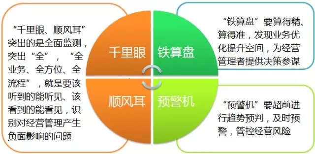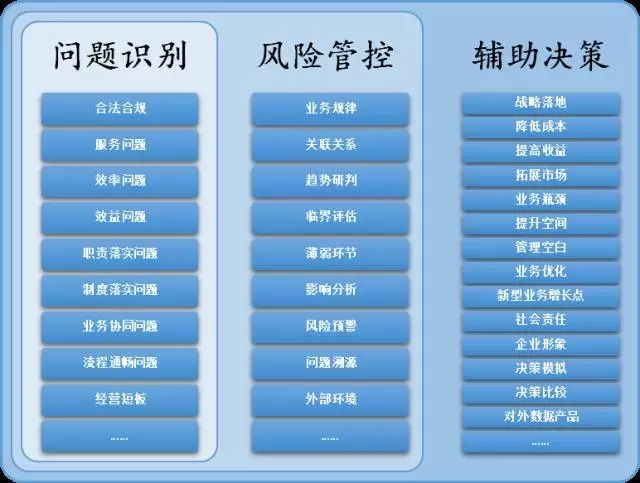 在感知與預防之上,是對企業運營的輔助決策(主動參謀),即對可能提升公司經營效果的業務空間或管理措施進行分析和評估,為經營管理者提供決策參謀。與具體問題的感知和預防相比,這一角度會在更大層面上影響企業的決策和業務變革方向。