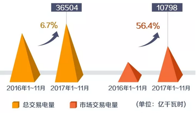 2017年1——11月份,國家電網(wǎng)經(jīng)營區(qū)域各電力交易中心總交易電量36504億千瓦時,同比增長6.7%,其中,市場交易電量10798億千瓦時,同比增長56.4%,首次突破1萬億千瓦時。2017年全年有望達(dá)到1.2萬億千瓦時,同比增長52%。