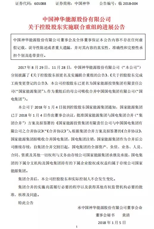 中國神華今日(1月5日)發布公告稱,該公司控股股東國家能源集團已于2018年1月4日作出董事會決議,批準國家能源集團與國電集團合并方案及擬簽署的《國家能源投資集團有限責任公司與中國國電集團有限公司之合并協議》。