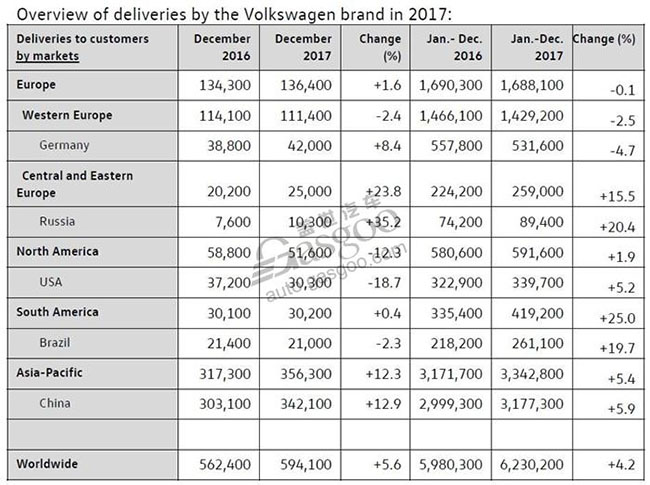 大眾品牌12月份及全年在中國市場的銷量均創下新的紀錄。12月份的交付量漲幅達到12.9%,接近39,000輛,同時也為單月歷史最好成績。大眾品牌2017年全年在中國市場的交付輛達到318萬輛,同時也是首次突破300萬輛。