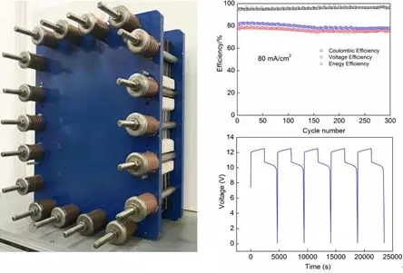 實用、可靠:研究團隊將單電池進一步放大組裝了千瓦級電堆(圖3),該電堆可以在80 mA/cm2 下穩定運行300圈以上,能量效率保持在80%左右。此外,電堆仍然具有短路恢復的特性,有力的證明了該體系的可靠性和實用性。
