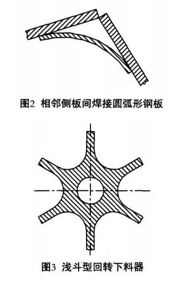 (1)內(nèi)部不能有煤粉堆積。灰斗等斗壁與水平面夾角不能小于70°,灰斗相鄰側(cè)板間(即灰斗棱內(nèi)側(cè))應(yīng)焊接半徑大于100mm的圓弧形鋼板(見(jiàn)圖2);灰斗外壁可設(shè)置振動(dòng)器進(jìn)行定期振動(dòng),以防止灰斗內(nèi)煤粉起拱棚料;灰斗下口要足夠大,以保證收集下來(lái)的粉塵灰能順暢下泄;內(nèi)部板材所有加強(qiáng)筋均應(yīng)該設(shè)置防積灰板,防積灰板與水平面傾斜角度也不能小于70°;采用淺斗型回轉(zhuǎn)下料器(見(jiàn)圖3),既能防止煤粉粘接又能有效泄灰、鎖風(fēng)和防止結(jié)露,下料器要設(shè)有速度感應(yīng)器,將下料器的運(yùn)行情況傳送到中控室,以便及時(shí)了解下料器的運(yùn)行情況。