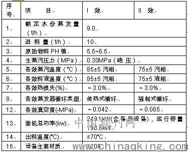 廢水經計量后進入一效分離室。二效蒸發系統在真空泵的作用下,使此二效蒸發系統的操作壓力控制在-0.04——-0.09MPa。廢水在一效分離器中經一效蒸發器均勻地在加熱管內壁從下向上螺旋流動,并利用一效強循泵進行強制循環蒸發濃縮。在蒸發器上端設有專門的汽液兩相共存的沸騰區,物料在沸騰區內汽液混合物的靜壓使下層液體的沸點升高,并使溶液在加熱管中螺旋流動時只受熱而不產生汽化,沸騰物料進入一效分離室完成汽、液分離,物料在一效系統內經多次自然式循環后,完成初步濃縮的料液在壓差的作用下進入二效分離器。