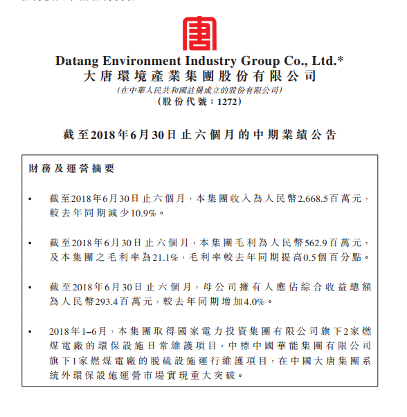 公告稱,2018年1–6月,集團取得國家電力投資集團有限公司旗下2家燃煤電廠的環保設施日常維護項目,中標中國華能集團有限公司旗下1家燃煤電廠的脫硫設施運行維護項目,在中國大唐集團系統外環保設施運營市場實現重大突破。