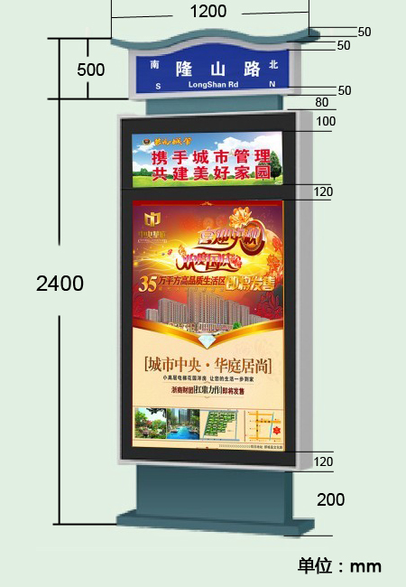 關于材質:我們制作路名牌、指路牌、路名牌燈箱、指路牌燈箱、廣告垃圾箱、候車亭、閱報欄等產品,因為都是定制化產品,所以材質、款式、顏色、尺寸等都不是固定的,我們是生產廠家,有自己的工廠和設計師,所以可以根據您的要求合理的提供您需要的產品,因為我們一直想給您提供更好的。