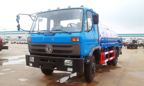 四、(東風145)10噸灑水車:駕駛室一排半、可以前翻、發動機玉柴140馬力發動機、900尼龍胎、罐體容積10.5立方、鋼板厚度4毫米、灑水車功能配置:前沖后灑、側噴、罐體后置工作平臺、綠化灑水炮、射程30米。