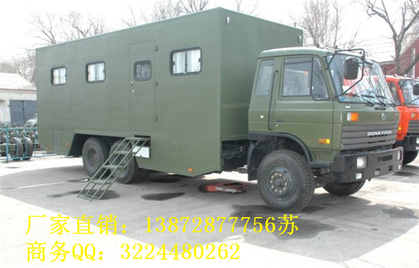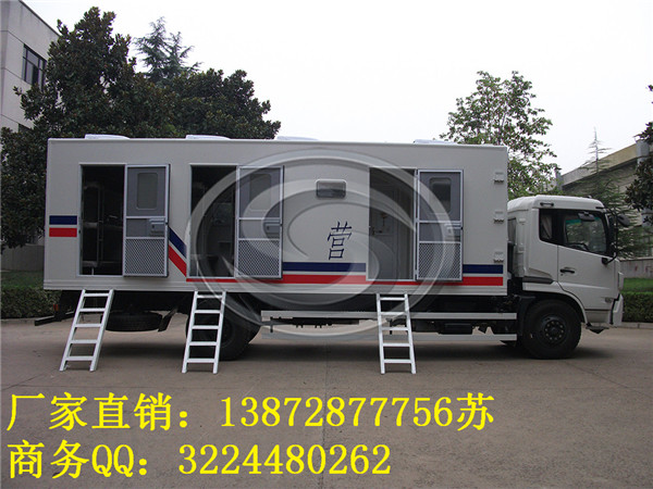 宿營車:適合于部隊、勘探、搶險等野外作業環境。其底板采用鐵木混合結構,折疊式雙邊板,增設活動支撐桿,可拆式帳篷。平時,可做普通高欄板車廂使用;需野營時,放平雙邊板并支撐好,搭好帳篷,就可形成一座面積不同的高臺帳篷,可供不同編制人員住宿使用。