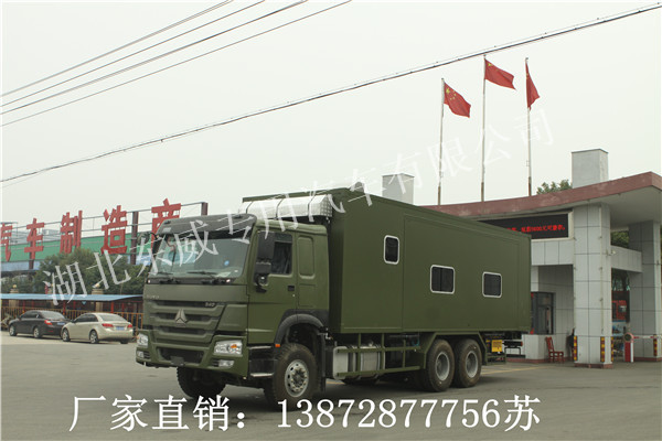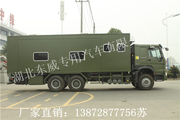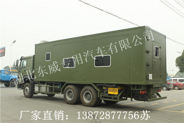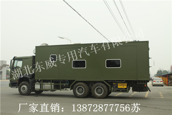 宿營車:適合于部隊、勘探、搶險等野外作業環境。兩邊設計的可抽拉的貨箱可供28人住宿生活。