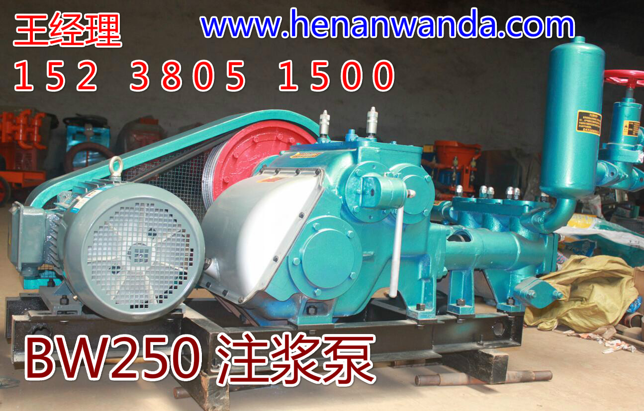 BW250型(注漿機)注漿泵為臥式三缸往復單作用活塞泵,該泵具有兩種缸徑和四檔速度。排量和孔深根據用途隨意調節,最深可和1500米鉆機配套使用,也可用語水泥漿灌注,本泵耗能少,操作靈活,優質耐用,分解性好,易于搬遷。