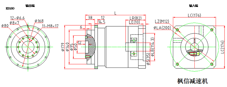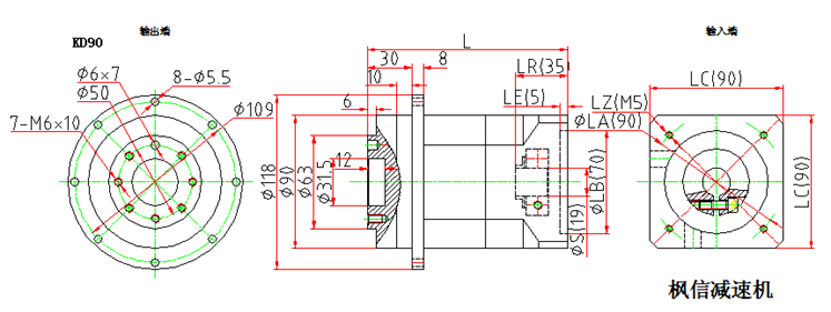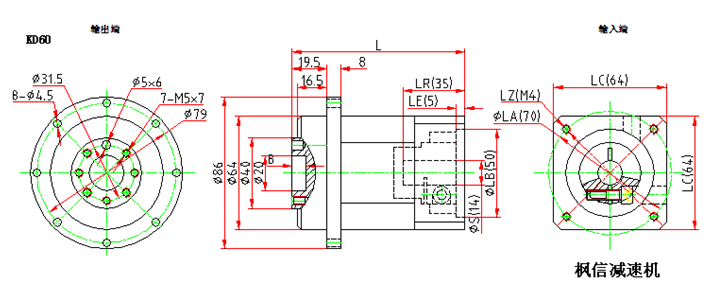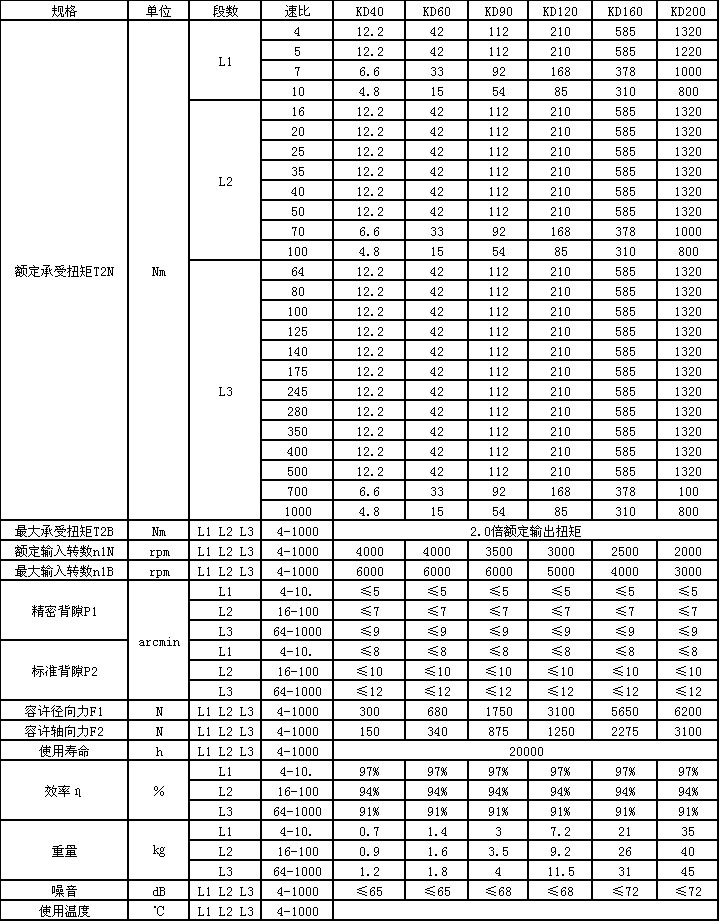 為法蘭盤輸出設計。型號分:KD40、KD60、KD90、KD120、KD160、KD200機座型號。速比:3~1000有20多個比速可選擇;分一、二、三級減速傳動;精度:一級傳動精度在5-10弧分,二級傳動精度在7-12弧分,三級傳動精度在9-15弧分。有數百種規格。